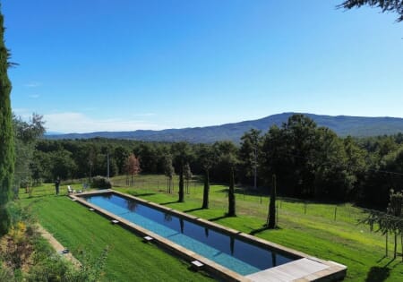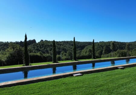 Un elemento architettonico che non interrompe il paesaggio ma lo completa. La scelta della forma allungata e il perfetto livellamento dello sfioro creano una superficie immobile e lucida che si fonde con le colline. Di notte, i fari LED a luce calda trasformano la piscina in una lama di luce che illumina elegantemente il prato.